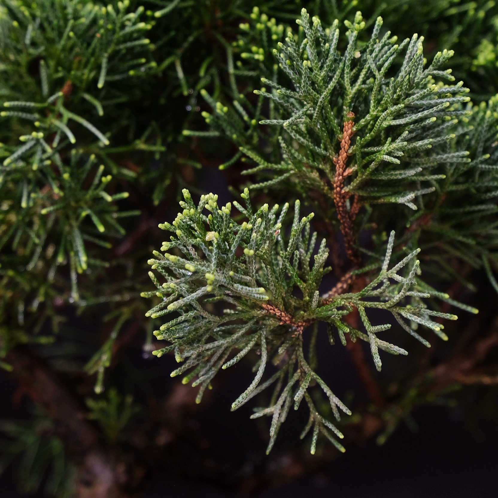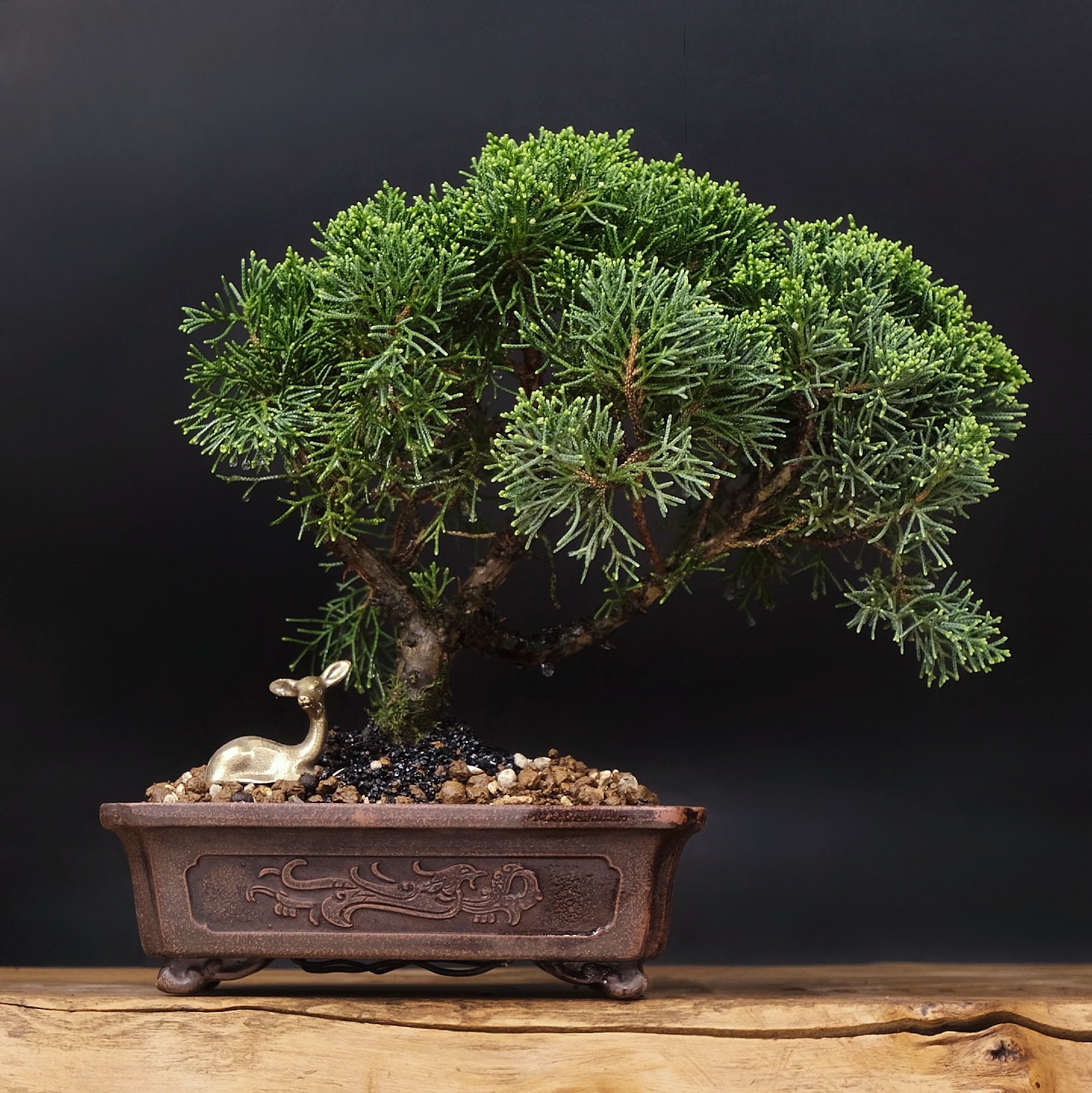 Бонсай сформирован из китайского можжевельника, относится к семейству Кипарисовых. В природе произрастает в Японии, Тайвани, а также на Курильских островах и Сахалине. Предпочитает скалистую местность, морские побережья, каменистые склоны. Является кустарниковым растением с мягкой чешуйчатой хвоей.
