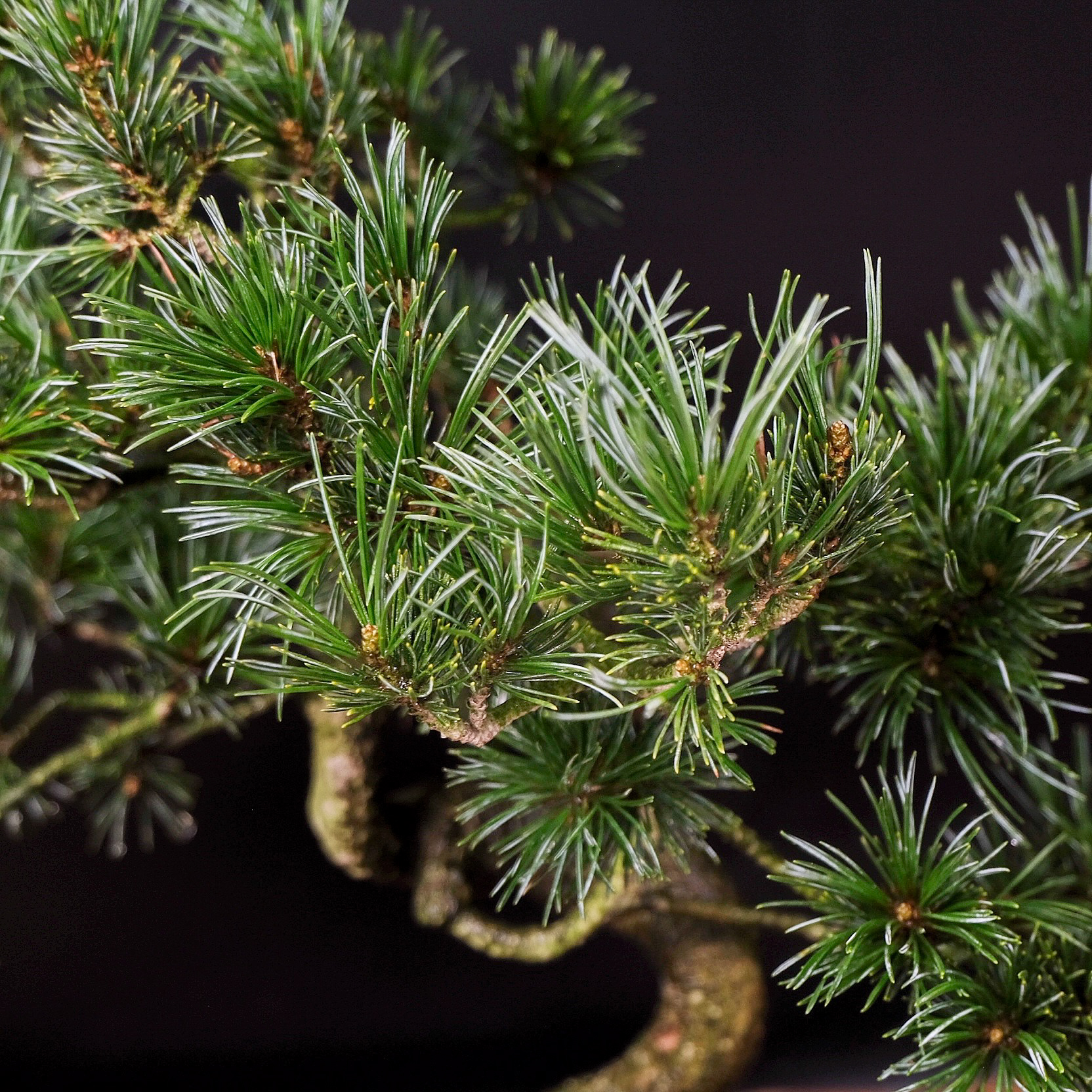 Побеги формируются двух типов – длинные и укороченные. Молодые ветви фиксируются тонкой проволокой в желаемом направлении. При чрезмерном загустении хвои, проводится ее выщипывание. Для уменьшения размера игл проводят обрезку до половины их длины.