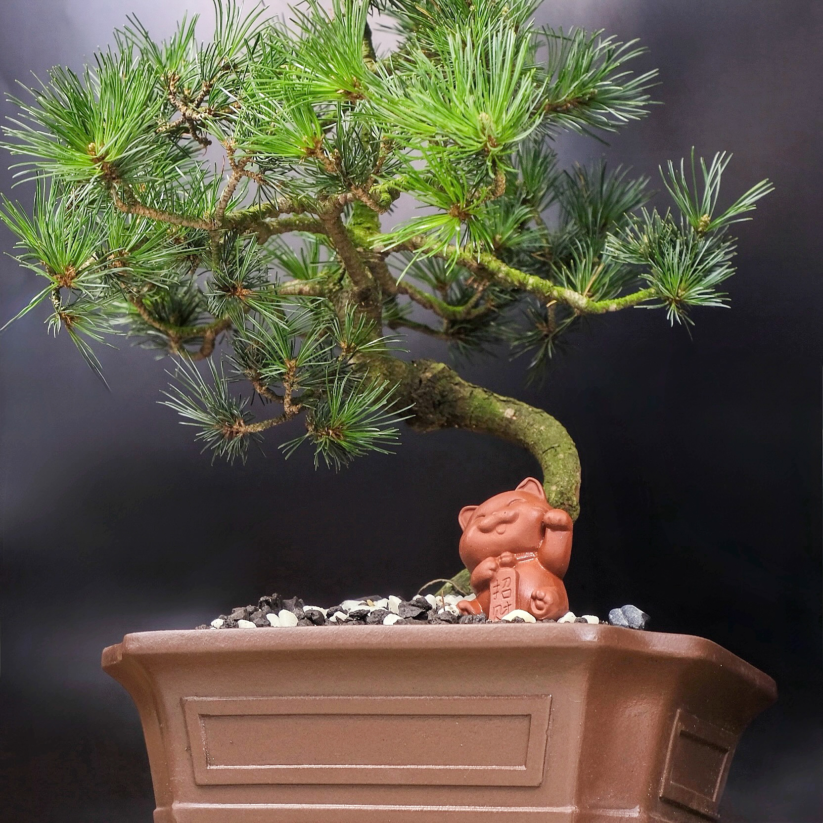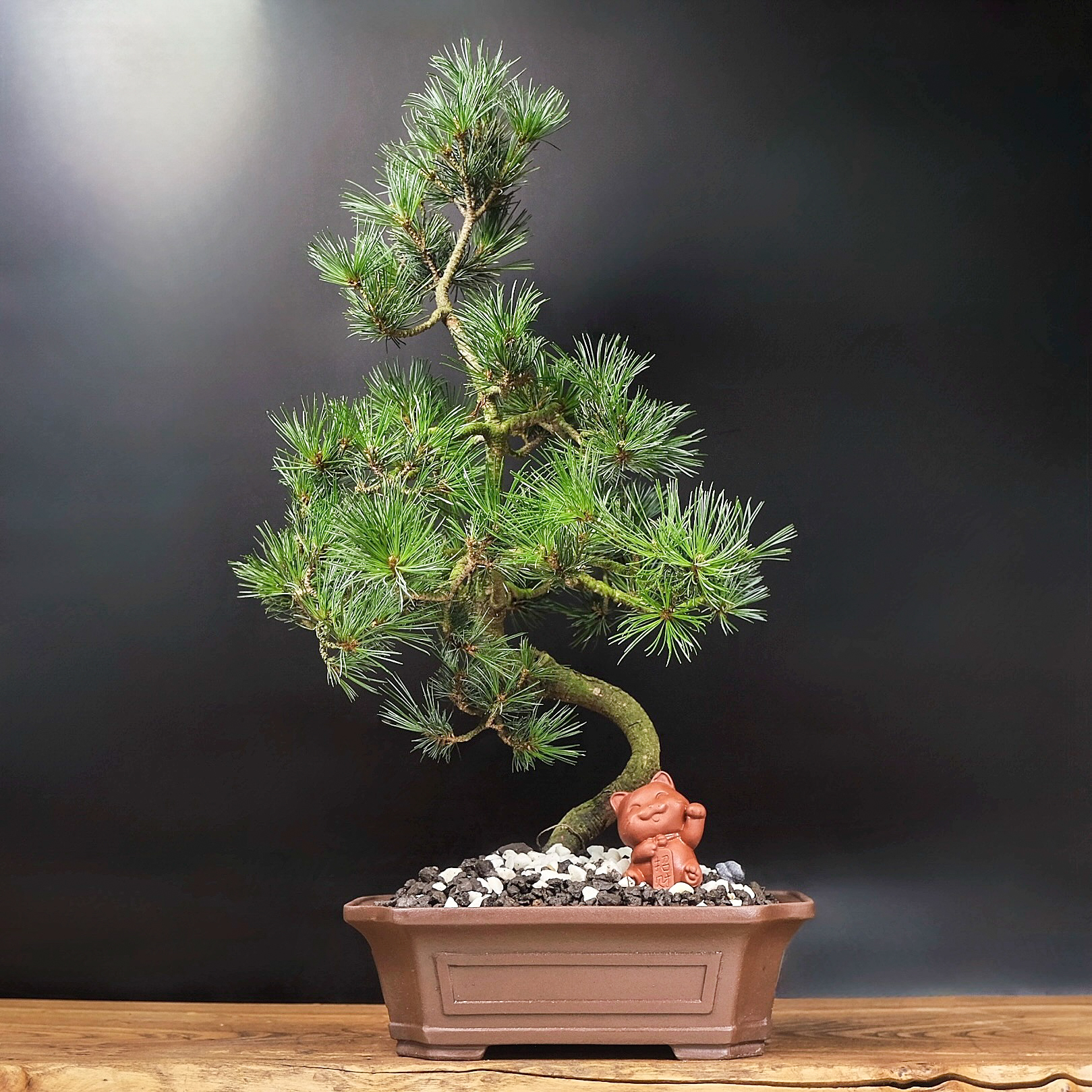 Бонсай сформирован в виде дерева с небольшим изгибом у основания ствола, крона имеет каноническую для хвойных бонсай пирамидальную форму. Изгиб ствола и количество ветвей могут отличаться в связи с индивидуальным формированием каждого растения.